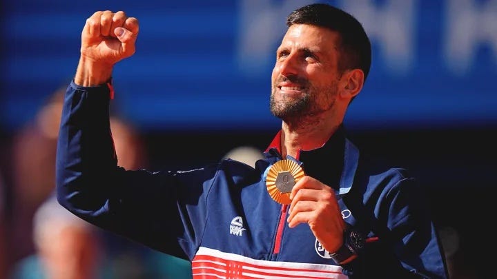 Novak Djokovic, at 37 and weeks after knee surgery, won Olympic singles gold in Paris by defeating Carlos Alcaraz of Spain in a 7–6, 7–6 match lasting nearly three hours. This victory marks Djokovic's first title of the year and fulfills his long-time goal. Having won every major event at least three times, every Masters 1000 title, and now a gold medal, Djokovic's career is unparalleled. Despite a recent loss to Alcaraz at Wimbledon, Djokovic showcased flawless play, particularly on serve, to dominate the match. This win adds to his legacy as possibly the greatest living athlete, further cementing his place in tennis history. More