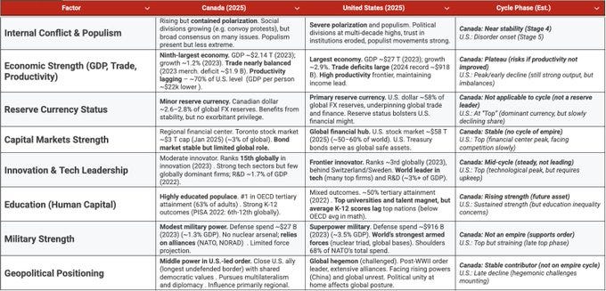 Note: Cycle phases are approximate interpretations under Ray Dalio’s framework. The U.S. has characteristics of a power in decline/disorder, whereas Canada, not a former world hegemon, is more of a stabilized middle power (its “cycle” is tied to the broader Western order’s health).