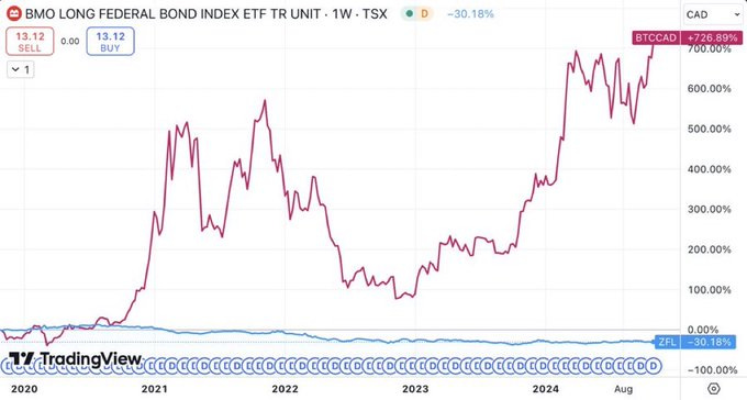 Canadian bonds have lost 30% of their value since 2020, contrasted with Bitcoin, which is the opposite - a decentralized, non-sovereign, capped-supply digital commodity that has gained 700% since 2020.