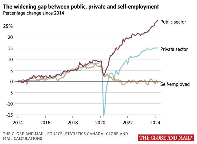 The Canadian government has ballooned in size in an attempt to prevent stagflation, creating a disparity between public and private sector work and hurting entrepreneurship. Even economists say this trend can’t last; like Canada's growing debt, it’s totally unsustainable.