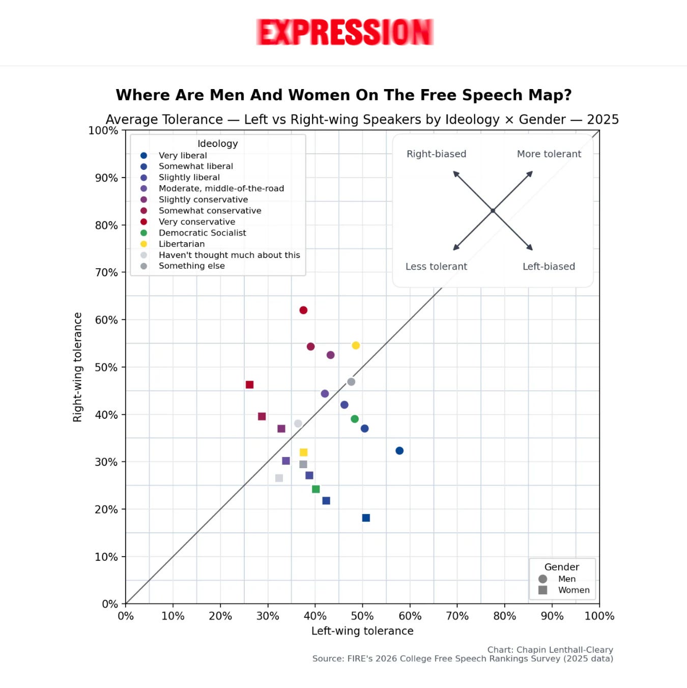 Recent data from the Foundation for Individual Rights and Expression (FIRE) shows that, across nearly every ideological category, men score higher in tolerance for both left- and right-wing speakers. Women, by contrast, score lower overall and display particularly strong hostility toward right-leaning speech. In practical terms, this means that men—regardless of political affiliation—are, on average, more tolerant of dissent than women across the political spectrum.