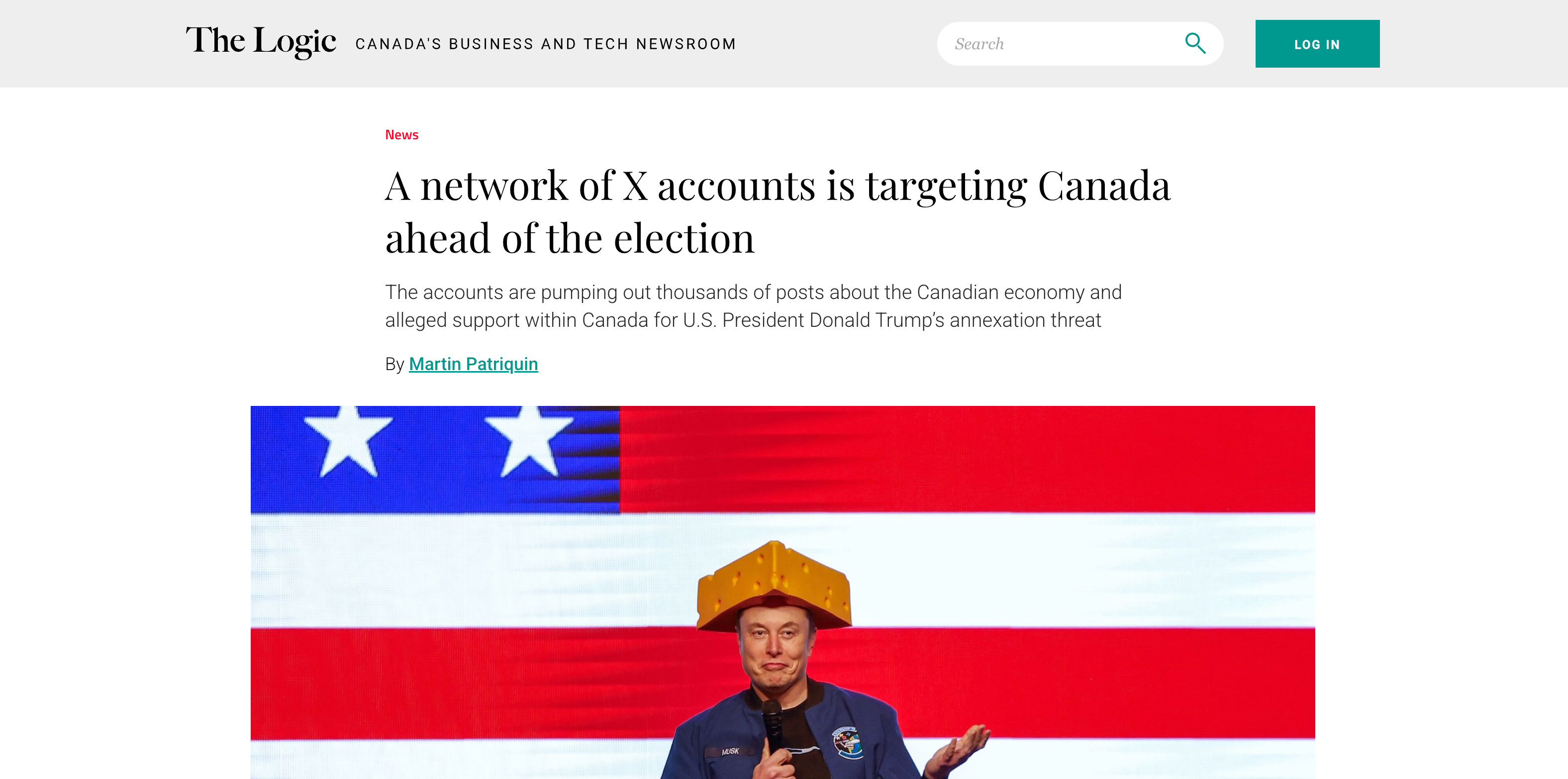 A recent article in The Logic, penned by Martin Patriquin, claims a shadowy “network” of X accounts is “artificially” amplifying right-wing messaging about Canada’s economy and leadership. The piece leans on a report from Reset Tech, a UK-based outfit calling itself a “digital threat research group.” Reset Tech alleges these accounts—73 identified, with “likely hundreds more”—are pushing misinformation about the election and showing support for Donald Trump annexing the country. The narrative is juicy: bots, conspiracy theorists, and Russian media like RT are supposedly orchestrating a coordinated assault on Canada’s election discourse, propping up Conservative Leader Pierre Poilievre and his policies. The problem? There’s no proof—just speculation piled on top of innuendo, with a hefty dose of anti-Elon Musk seasoning thrown in for good measure.