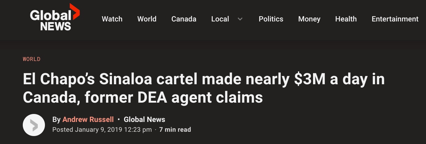 Cartels generate staggering amounts of cash. In 2019, Global News reported that Joaquín “El Chapo” Guzmán’s Sinaloa cartel was clearing more than $3 million a day in Canada, according to a former DEA agent.