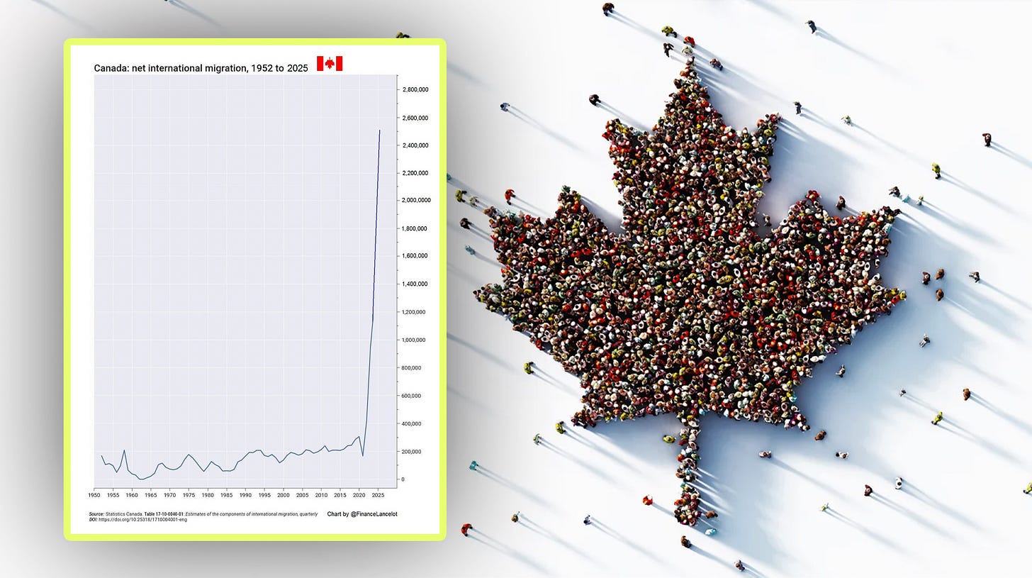 A glance at Canada’s net international migration chart from 1952 to 2025 reveals a nation undergoing a silent revolution. For decades, migration levels remained stable, rising and falling from around 50,000 to 250,000 annually. But something broke post-2020. Beginning in 2021, net migration explodes vertically—climbing past 1 million and projected to reach nearly 2.5 million by 2025. This isn’t a trend—it’s a regime shift. What was once a steady, managed immigration system has become a flood. And this figure includes not just permanent residents, but also temporary workers, international students, asylum seekers, and visa-holders. It reflects a deliberate policy shift, not a spontaneous surge. Canada is no longer simply accepting immigrants—it’s importing a population at a pace unmatched in its history.