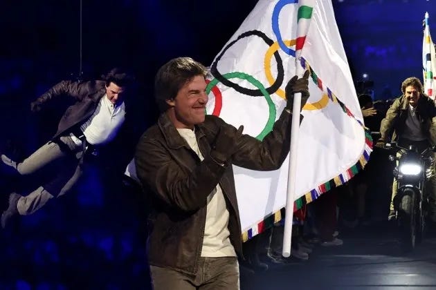 Tom Cruise concluded the 2024 Paris Olympics with a dramatic skydiving stunt, swinging from Stade de France and landing on the field. He then received the Olympic flag, mounted a motorcycle, and rode through Paris landmarks in a pre-recorded video before jumping from a plane and transforming the Hollywood sign into Olympic rings. The flag was handed off to cyclist Kate Courtney, who then delivered it to a Red Hot Chili Peppers concert in Los Angeles, marking the start of the countdown to the 2028 Games. More