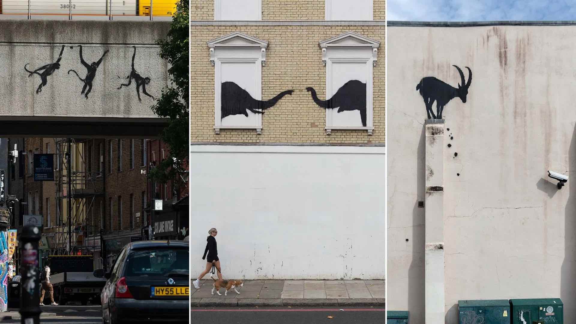 Over the past three days, Banksy has transformed London with three new animal-themed murals. The latest, in East London, features monkeys climbing train tracks, while earlier works include a horned goat facing a security camera in Richmond upon Thames and two silhouetted elephants reaching for each other from boarded windows in Chelsea. Though Banksy hasn’t explained the murals, fans speculate they comment on environmentalism or surveillance. Banksy, known for politically charged art, recently sparked controversy with a refugee-themed display at the Glastonbury Festival. More