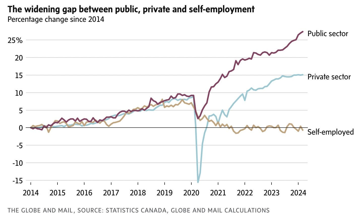 This is basic level economics. You cannot have an expanding State, which is a non-productive entity that survives only by extracting wealth from productive entities, while the private sector shrinks or stagnates. The State is an economic parasite draining its host (citizens) of too many resources, leading to a slow death of both entities. This process has already begun. According to the Fraser Institute, the average Canadian now spends more on taxes than on shelter, food, and clothing combined.