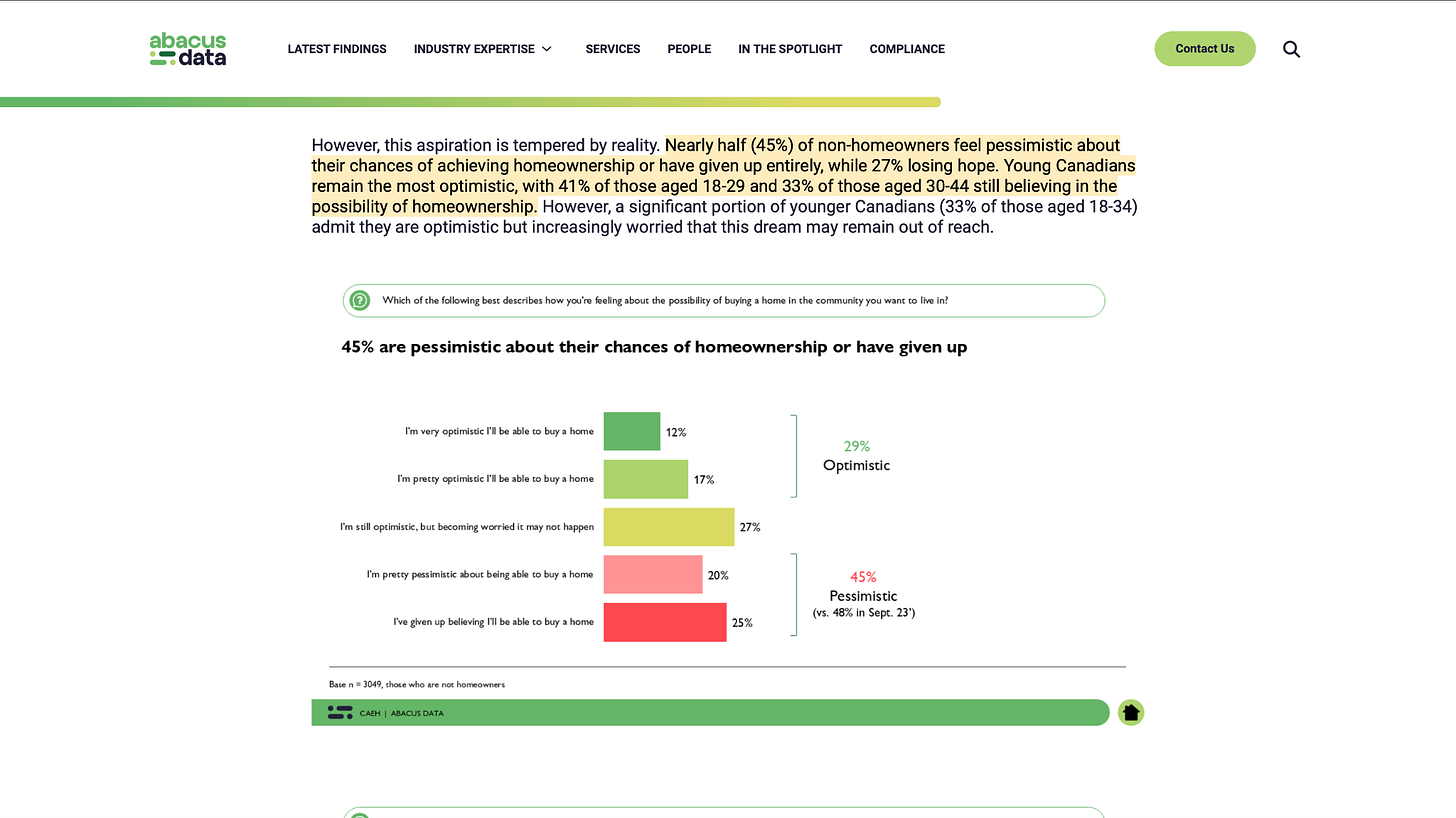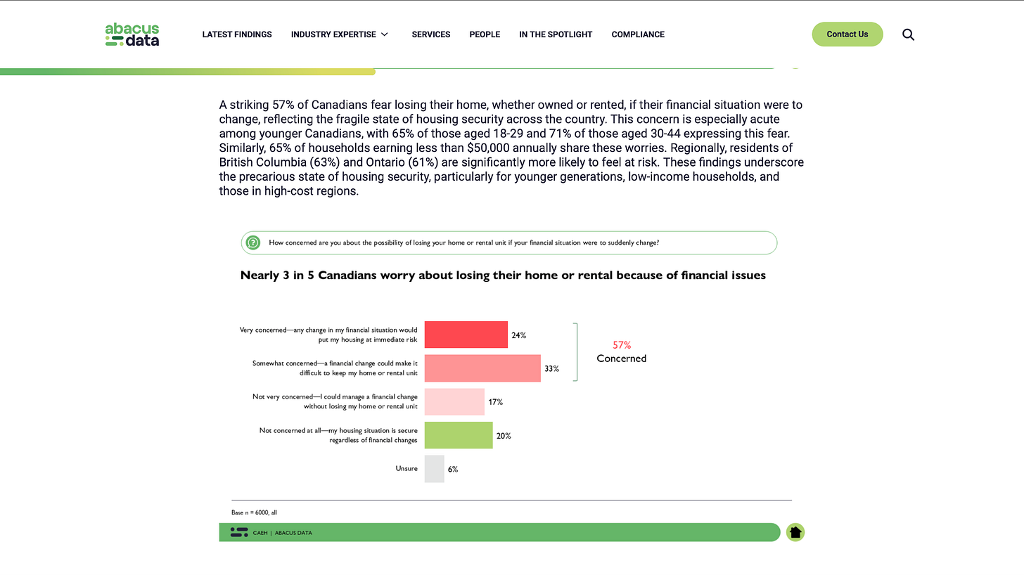 3 in 5 Canadians are both worried about their ability to pay for their mortgage or rent and fear losing their homes or rental because of financial issues. Among non-homeowners, almost half believe they’ll never own a home. That’s not a small frustration—it’s a structural problem that destroys the foundation of western society. Home ownership isn’t just an investment for families, it’s a tie to their nation and proof of a stake in your country.