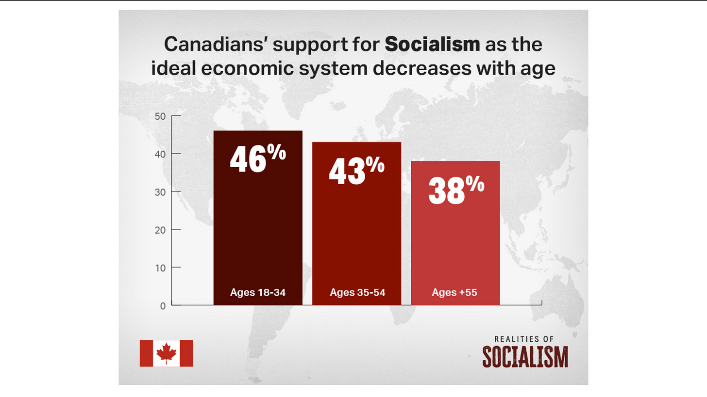 So yes, support is strongest among the young—but nearly 4 in 10 older Canadians feel the same way. That’s not fringe, that’s almost half. Among ages 18–24, support reaches about 50%, one in two. That number may soften with age, but for now, it’s real. I believe there are 3 very strong reasons why so many people find socialism so attractive.