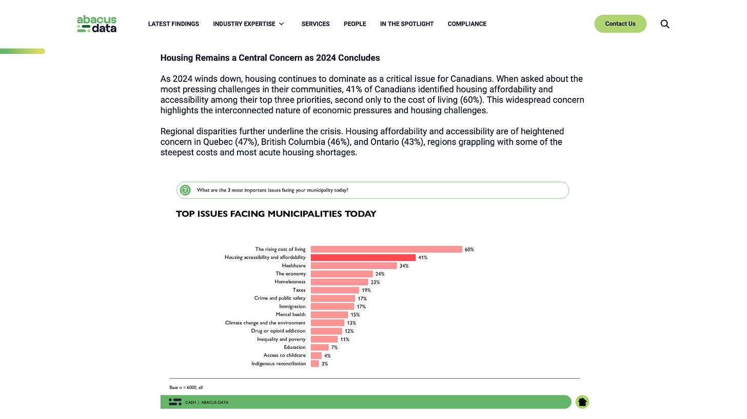 Abacus data conducted a national survey asking Canadians about their top concerns when it comes to the state of the country. 60% of Canadians cite cost of living as their number 1 concern, 41% point to housing affordability, Nearly 90% are worried about the current state of housing and that increases to 91% for Canadians 18-44.